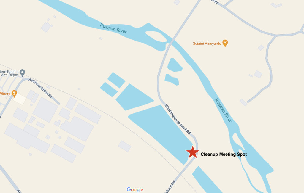 We’ll meet at the Russian River Bridge (see image for exact meeting location). From there, volunteers can choose from a variety of walking routes based on where trash is most concentrated.