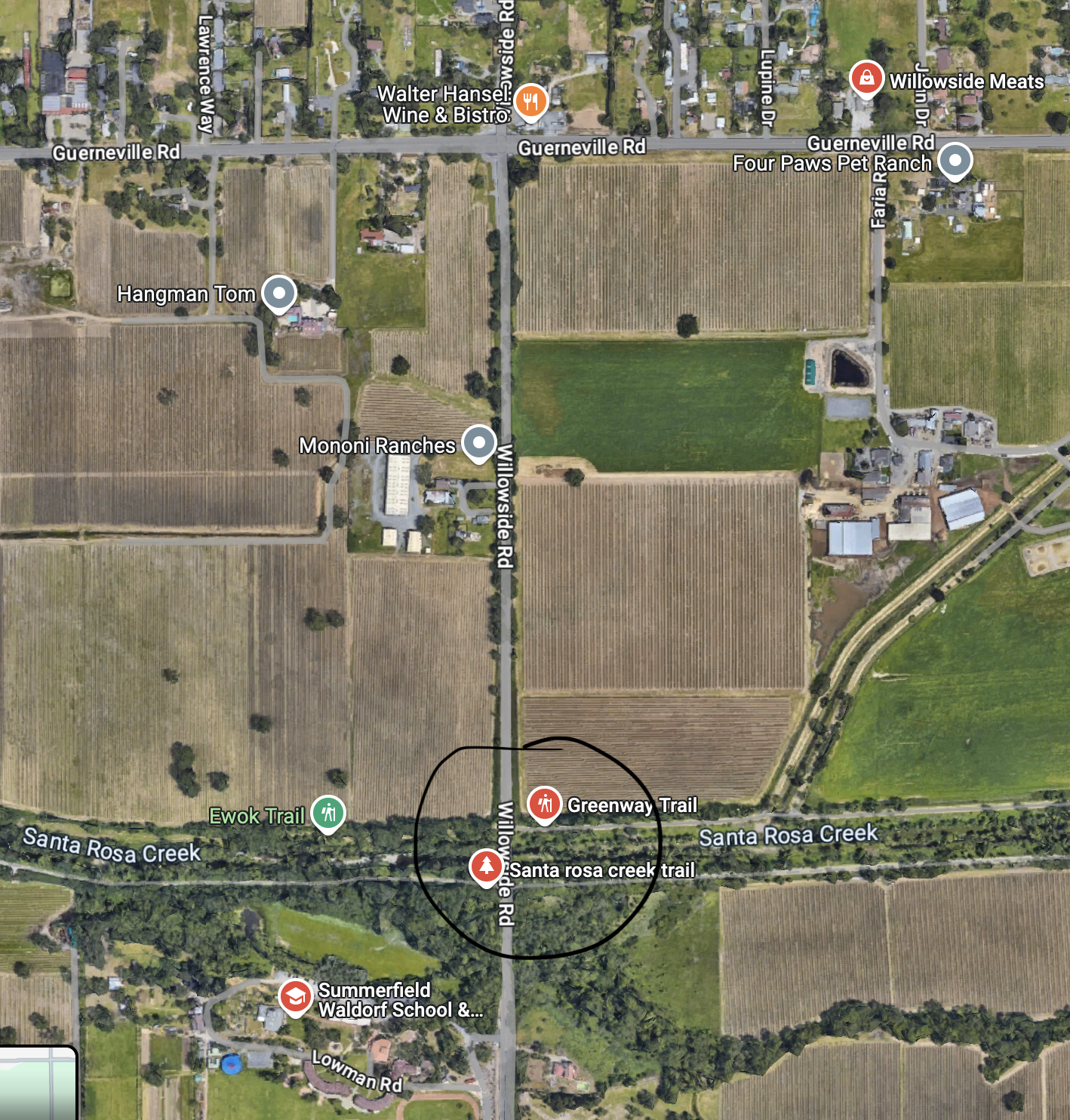 Starting at the Willowside Rd. crossing. See map for exact location- it's down the road from Mononi Ranch at 1295 Willowside Road. Open parking will be before the Willowside bridge.
