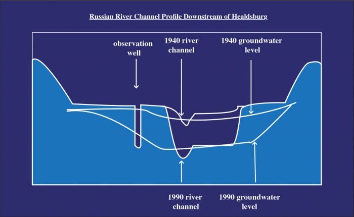 How did we lose potentially billions of dollars worth of free natural services? Simple, we cut the River off from spreading on to its floodplain during the rain season because of channelization, mining and thousands of dams large and small. These actions have resulted in the river’s bed down-cutting or incising up to 25 feet in some parts of the Russian River. The graphic below illustrates this dynamic by showing the riverbed elevation in the 1940’s and today.
